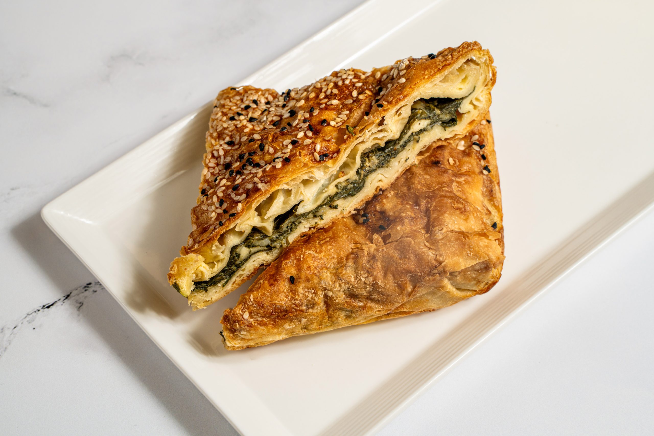 Our Borek is made from scratch. It features thin, handmade layers of dough filled with spinach, feta, mozzarella, and onions. Every layer is sauced with egg, milk, and yoghurt and then baked to perfection for a delightful texture. Comes with green seasonal salad with tzatziki and hummus on the side.